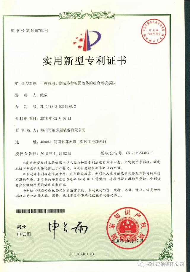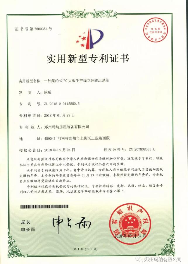 近兩個月,瑪納公司喜獲兩項(xiàng)新型實(shí)用證書,分別是“一種集約式PC大板生產(chǎn)線立體轉(zhuǎn)運(yùn)系統(tǒng)”和“一種適用于拼裝多種幅面墻體的組合墻板模塊”。號分別為:ZL 2018 2 0145880.5和ZL 2018 2 0211236.3。