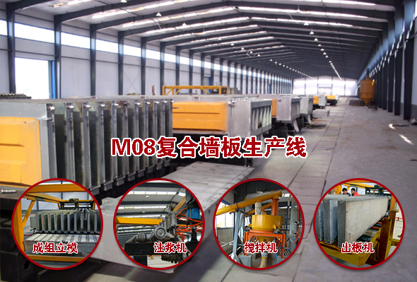 M08復(fù)合墻板生產(chǎn)線主要設(shè)備組成有:集約式低能耗養(yǎng)護(hù)室、第三代成組立模、立模回轉(zhuǎn)機(jī)、上抹面成型機(jī)、第三代液壓抽芯機(jī)、壓力注料系統(tǒng)、合板翻板機(jī)構(gòu)、推板機(jī)構(gòu),標(biāo)準(zhǔn)生產(chǎn)線產(chǎn)能年產(chǎn)達(dá)50萬㎡(2440mmX610mm)。