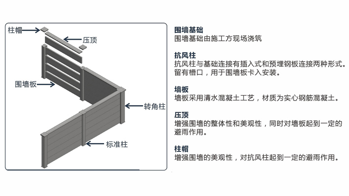 預制鋼筋混凝土圍墻是一種以墻體、墻壓頂、抗風柱、柱壓頂、鐵藝五種部件組成的新型裝配式圍墻。