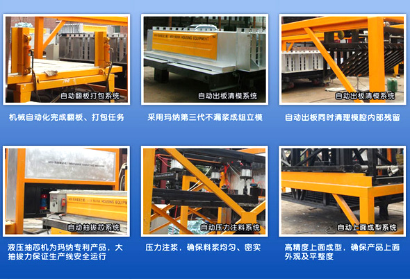 二、瑪納公司成組立模機應用模腔雙面成型的原理;采用機動開模合模技術、連續張緊式布網、自動溫控電加熱、先注漿料后穿芯管、模腔厚度長度可調控等技術。與國內外同類技術比較有明顯的優勢。