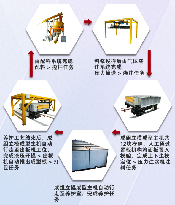 整個過程:配料→攪拌→置板→壓力輸送→澆注入!B護→開!霭鍣C出板→循環